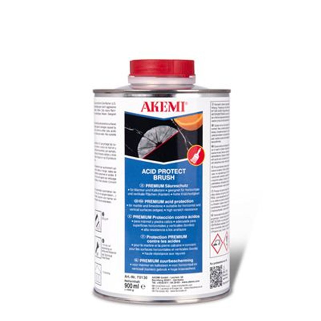 Protective coating for kitchen worktops, dining tables and washbasins made of marble, limestone and other acid-sensitive surfaces against mechanical damages and common household stain formers (e.g. vinegar, citric acid, red wine, coffee, cola and cooking oil) as well as against acidic cleaners (e.g. sanitary cleaners). Application with a brush or toothed spatula for new and already installed or laid surfaces. Ideal for repairs and touch-ups. After hardening (with UV lamps approved by AKEMI) the gloss can be adjusted from matt to highly glossy. Slight scratches can be polished out of the treated surface. Application on horizontal and vertical surfaces (e.g. table edges, washbasin fronts). For indoor use. Only for professional use.