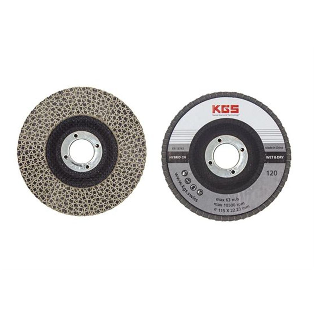 KGS Hybrid® diamond flap disc is suitable for coarse grinding. The disc is built up of metal bonded diamond flaps, making it very aggressive. The material removal and speed of the KGS Hybrid® disc are comparable to those of cup wheels, but the vibration of the machine during use is considerably less.